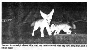 Fennec foxes are native to North Africa and to the Middle East, where their habitat is being destroyed. They weigh about 3 lbs. and are sand-colored, with big ears, long legs, and a small head. They're a desert animal that preys on insects, rodents, rep-tiles, and sometimes eats plants. They can dig very quickly to catch prey or escape an enemy.