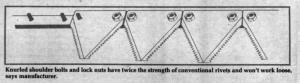 Kondex uses specially-engineered knurled shoulder bolts and lock nuts which have twice the strength of conventional rivets and won't work loose, Wessing points out.