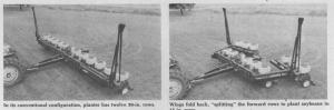 When planting wide rows, the extra 13th row unit is removed. It'sthe only row unit that has to be touched in switching from wide to narrow rows, or vice-versa, on the 12 row toolbar. All other row units automatically move into position as the toolbar folds or unfolds hydraulically ù in less than five minutes.