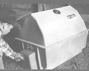 The "Roy-L-Heat" incubator, developed by Montana rancher Duane Roy, is made from high-density polyethylene and measures 37 in. long, 22-in. wide, and 3 ft. high. It's big enough for calves or sheep to lay down or stand up. Weighs 65 lbs. A 110-volt heater and fan at one end circulates warm air around the calf and also under a raised floor grate. A rubber "head boot" opposite the heater lets the calf poke its head outside so it can breathe fresh air without lowering the temperature inside. An adjust-able "attic vent" on top allows excess moisture produced by animal respiration to es-cape.