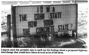 When the Iowa Department of Transportation proposed a new highway interchange that would take several acres of Iowa farmer LaVerne Lingren's farm, he came up with an effective new way to protest. He set up a portable sign - the type usually spotted on used car lots - and spelled out his feelings about the new highway design - in no uncertain terms.