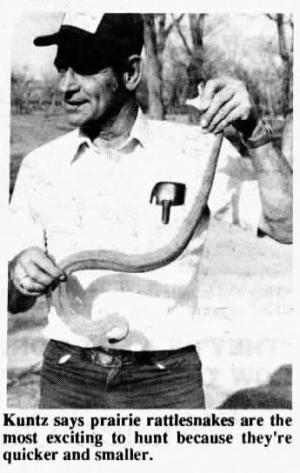 The most success Kuntz ever had in a single day occurred one spring several years ago. "We came upon an old cistern filled with trash, cans, wire and old lumber. After removing the lumber, they had no way of getting out. All we-had to do was put them in a cage with our catcher. We got 188," says Kuntz, adding that in his most successful year ever he caught 428. In nearly 50 years of snake hunting Kuntz figures he's caught more than 13,000 snakes. He's never had a serious "accident" since the first time he was bitten and, in fact, he doesn't even take along a snake bite kit. "We leave the medicine at home and take our respect for them along with us," he says.