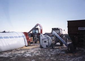 Martin also makes equipment for using a silo blower roller mill to fill the bagger with grain or silage. A gooseneck equipped with a telescoping pipe fastens with a swivel clamp to the roller mill and a combination bin and dust collector mounts on top of the bagger.