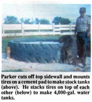 Parker has also experimented with stacking worn-out tires one on top of the other to form inexpensive and durable 4,000-gal. water tanks. He's had interest in his 12-ft. high tire tanks from local fire departments looking for a cheap, no-maintenance way to store water in rural areas. He fills the bottom tire with concrete to seal it to a concrete pad and then bolts the tires together, sealing them with silicone. He places a cover made out of styrofoam insulation on top.