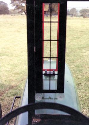 The rectangular frame on the hood is positioned so that its inside edges can be seen through the screen from the tractor seat.