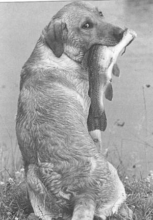Michael has now trained Bertie to sit patiently until a fish has been hooked and be-comes tired. At that point Michael gives him the nod to dive in. "Because he's a trained shooting dog as well, he has a gentle mouth and does not damage the fish or the line. I use him instead of a net," says Michael, who is a farm consultant.