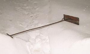 Now, we use this corner scraper to make the job easier and safer. It consists of a 24 by 8-in. paddle cut out of corrugated grain bin steel. The T-shaped 7-ft. long handle is a piece of 3/4-in. dia. reinforcing rod and is fitted with a gusset between the handle and paddle. There's a hook near the paddle that we use to hang the scraper on the side of trucks.