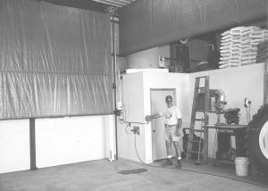Each curtain is simply a 20 by 50-ft. conventional plastic tarp hung from the rafters. An electric gear motor attaches to one end of a 2 in. dia. steel pipe sewn into the bottom of the curtain. The motor "walks" up and down on a piece of sq. tubing that runs from floor to ceiling, rolling - or unrolling - the curtain as it goes.
