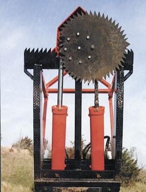 What makes the new tree saw unique is that it consists of a toothed saw blade attached to a pair of hydraulic cylinders that slowly rotate the blade into a tree. "It uses power, not speed, to cut wood," says Marshall.