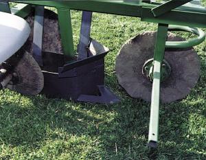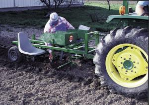 In operation, the tractor 3-pt. lifts the entire planter and riders together. When it's in the ground, two rubber-tired wheels off a lawn mower act as gauge wheels to maintain proper depth.