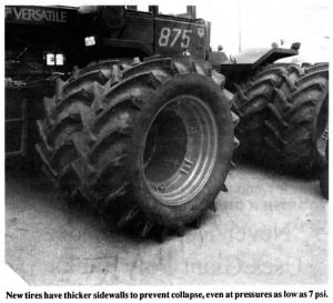 John Steinberger, Kenmore, N. Dak., was one of the first farmers in the U.S. to try Trelleborg tires. He mounted 25.6 by 38 tires on his Versatile 875 4-WD tractor and used it last spring to seed about 2,000 acres of wheat. He also did some plowing. "The tires greatly reduced wheel slippage and reduced soil compaction," says S teinberger. "I bought the tractor used for $35,000. The cheapest used Challenger I could find cost $75,000. The tractor was equipped with 20.8 by 38 dual tires that were worn out.