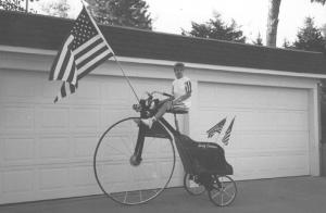 "My granddaughter often rides it in parades. It's a lot of fun for her and the parade watchers get a kick out of it," says Fechter. "I mounted a pair of Buick car horns on front and when she blows them it really gets people's attention. A big American flag mounts in a holder on front, and a pair of smaller flags mount behind. The single front wheel is off an old dump rake while the rear wheels are off old implements of some type. I mounted 1/2-in. thick rubber conveyor belt on all three wheels to make it ride smoother.