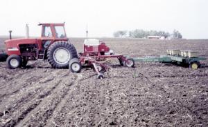 He owned an IH 500 3-pt. mounted, 8-row, 36-in. planter equipped with newer-style model 800 row units as well as lift assist wheels. He paid $3,000 for a used Deere 7000 8-row, 30-in. planter equipped with Kinze bean meters and converted it to a 7-row, 36-in. planter. He pulls the Deere planter behind the IH planter when planting beans.