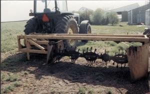 When Ken started composting in 1986, he built a pull-type composter by rebuilding a Howard Rotovator. He stripped it down, taking the gearbox bearings and half the 20-ft. shaft. He built a new frame out of 4-in. sq. tubing and hung the shaft from it.