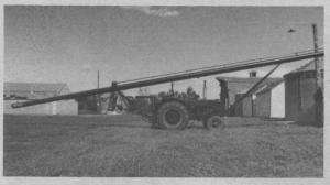 "I removed the old carriage and made a new one to fit the tractor so that one hydraulic ram lifts the intake end. An orbit motor replaced the winch. It lets us raise and lower the auger from the tractor seat. Another gearbox was added for the auger pto drive. At harvest, the hopper is attached permanently to the auger.