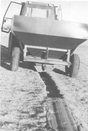 "We put together a bottom unloading wagon with a screed (a smoothing blade) from scraps we had around here," Stevenson says. The wagon is pulled directly over the track to be filled. Fill material pours from the bottom-unloading wagon into the rut. The screed scrapes down the ridges on both sides of the rut and levels fill material as the wagon passes by.