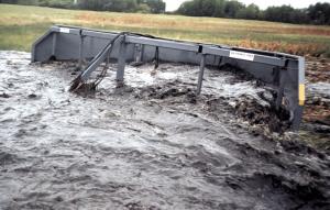 The patent pending water drag is a 25-ft. wide steel frame designed to be pulled by a 150-ft. cable behind a tractor. The tractor driver pulls the drag up next to the water hole, and then drives the tractor around to the other side. Then the drag is pulled through the water. It pushes water ahead of it as the driver pulls the drag out onto surrounding crop land.