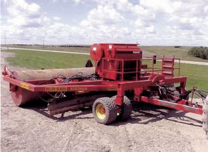 The 20-ft. wide, hydraulic-powered machine is equipped with a pair of 10-ft. steel "swing blades" that can be angled forward or backward. A big 4-ft. dia., 11/16-in. thick steel roller weighing 6,200 lbs. follows behind the blades to press seeds and/or small rocks into the soil. A Valmar air applicator mounts on top of the machine, distributing seed between the blades and the roller. Seed is blown through tubes onto a deflector shield and falls onto the ground just ahead of the roller.