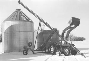 The tractor is positioned midway on the auger tube, so he can use the auger both for filling and emptying bins.
