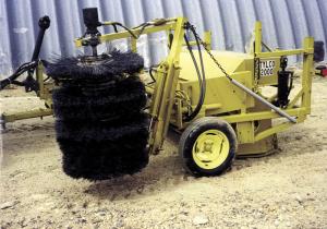 The 2-wheeled machine is equipped with a flail-type chopper that measures 6 1/2 ft. wide, as well as a 32-in. dia., 40-in. high brush. The brush is operated by an orbital motor driven by a pto-operated pump. A hydraulic cylinder is used to raise or lower the brush on uneven ground.áThe brush rotates clockwise. As the driver moves forward the brush sweeps the weeds into the chopper, which then chops them up and blows them out the back.