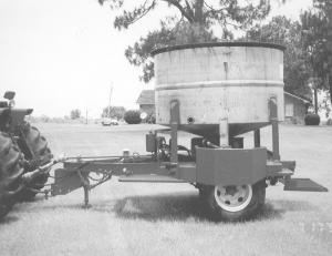 On the trailer, he mounted a stainless steel hopper-bottomed fertilizer mixer tank. He wanted to use stainless steel augers to distribute the fertilizer out each side of the tank, but found that a pair of augers would cost $3,000. After an extensive search, he found some at a feed store which had been special-ordered for a customer who later changed his mind.