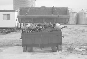"I used a cutting torch to make a few holes in the bottom so water can drain out," he says. "The bin sits outside our shop until it's full, and then we pick it up with chains hooked to the front and back of the loader bucket. We dump it into a big bin we get from our local recycling company."