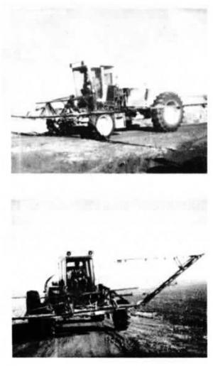 Five-section shop-built booms have a stationary 12-ft. wide center section with two 10 ft. hydraulically folding wings on each side. Each section has separate shut offs. Nozzles have 3-way selectors to permit applying 10, 15 or 30 gpa.