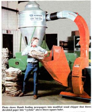 The system consists of a Valby chopper that blows chopped-up paper into a "cyclone" tank mounted above the feeder auger on a Deere square baler, which then makes normal-sized, 60-lb. bales. Hundt sells the system as a complete package or makes any of the components available separately.