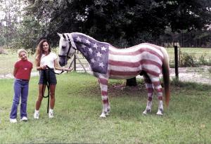 Since September 11, millions of Americans have demonstrated a renewed sense of patriotism by flying the flag. Renee Linzalone decided to go one step further by painting the American flag on Captain, her 21-year-old white Arabian horse. Renee and husband, Mike, live on a small farm near Newberry, Fla. They used clothing dye and shoe polish to paint the stars and stripes on both sides of the horse.