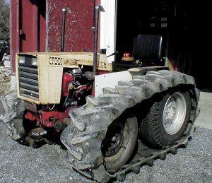 To make the tracks, Brown cut the sidewalls off a pair of 16.9 by 28 bias-ply tractor tires. He fitted the underside of the tread with U-shaped metal guides that attach with two bolts apiece and ride over the top of the tractor tires. There are 18 guides per track. The sides of each guide come straight down on either side of the tires.