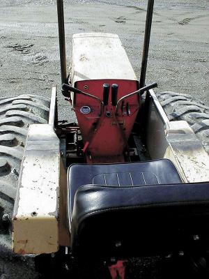 The tractor was fitted with an auto master brake cylinder which is controlled by two steering levers. One brakes the wheels on one side of the tractor and one brakes the other side. When Brown started using the tractor, he found that the rear garden tractor brakes were not strong enough to turn the tractor on dry ground. So he bought 10-in. dia. motorcycle disk brakes that had the same bolt pattern as the rear wheels. Once he installed those, the tractor worked perfectly, practically turning in its tracks. "It leaves a 2-ft. circle at the center when you turn 360?," he notes.