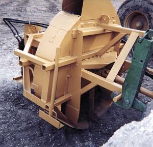 Schnack stripped the blower down to the star wheel, pto shaft and bearings, removing all the sheet metal from around the blower. He replaced the original paddles with heavy duty ones that he made out of 3/8-in. thick, 4-in. wide angle iron. He used 1/4-in. thick steel to build a new 18-in. wide housing, leaving the bottom part open to serve as a sort of a shovel edge to cut and guide soil into the blower. He made a discharge spout out of 1/8-in. thick metal and used 2 by 3-in. tubing to make a 3-pt. quick hitch. A homemade, hydraulic-controlled skid plate on back doubles as a depth gauge.