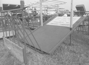 The "Ultimate Hay Saver" is sold as a kit that consists of a steel pipe frame and brackets. It measures 8 ft. wide. The buyer furnishes the boards and plywood sheets that are used to build the floor, which slants down toward the front. There's a 2-ft. high wall at the bottom where cattle feed and a 2-ft. space between the wall and a series of slanted steel pipes that the bottom bale rests against. The hay continuously moves down into the manger as the cattle eat. The unit can handle up to 4,000 lbs. of hay at a time.