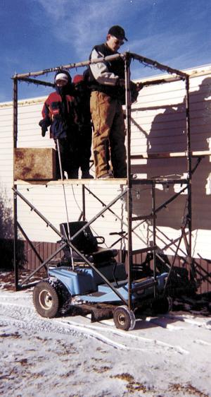 "It gets a lot of laughs but it's really practical," says Nordby. "I've used it to re-side my home and to do painting work, and even to put up outdoor Christmas lights. From the scaffold, I can reach all the way to the roof of a one-story house with no problem. The only thing I can't control from the platform is the machine's speed. I usually set the throttle at a little faster than idle. If I want, I can drive the machine conventionally from under the scaffold. To adjust the platform's height all I do is change the position of two bolts.