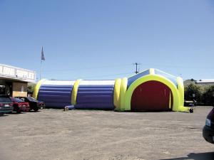 Each Airbarn comes with a 240-volt A/C electric blower. It takes only five minutes for one person to erect a building. Twelve stakes serve as anchors.