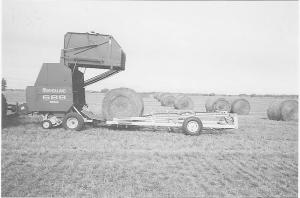 The Bale Buncher works on any hard core baler. It consists of a two-wheel trailer and a push plate hitch that bolts to the baler axle. The trailer hooks to a ball joint beneath the push plate.