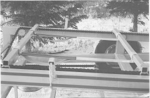 The 3-bale trailer is made from 3 by 5-in. box tubing with the axle mounted between the space for the second and third bales. A motor driven chain fitted with crossbars pulls bales to the back. As a bale is pushed onto the trailer, it falls between two cross bars and onto two 4-in. wide straps that cradle the bale. While set for full size bales, shortening the chain intervals between bars allows smaller bales to be handled equally well.