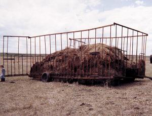 I make Farmhand 10-ton loose hay stacks and use a front-end loader to load the trailer-feeder with about half of a stack. I move the unit out to pasture during the spring for our cows and also during the fall for calves. It also serves as a windbreak.