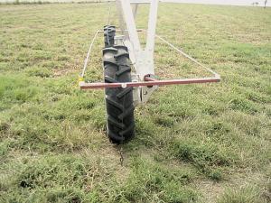 An attachment is available that's designed to keep calves from getting run over. An insulator on the T-bar supports a piece of wire with a short length of log chain attached to it. The chain hangs about 2 in. off the ground, directly in front of the tire. As the sprinkler moves forward, the electrified wire startles the calf into moving away from the tire.