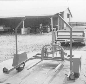 Up front, he added a tongue, again using 2-in. channel iron, and a ball hitch. In the center of the area created over the two front cross pieces of the frame, he built a platform on which he placed a mast, made of 2-in. angle iron. He put a modified 3-pt. hitch on the mast. The hitch rolls up and down the mast on rollers made from pipe. It's raised by way of a cable winch.