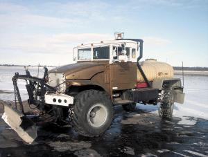 He happened to have a pair of 24-in. wide tires, and put them on the front of the truck (the original tires were 14 in. wide) for snow plowing. He says these wider tires make it easier to back out of freshly piled snowbanks.