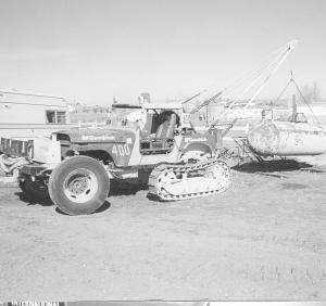 He also removed the rear axle from the CJ5, and replaced it with an old set of tracks from a Cletrak tracked tractor.