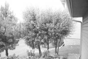 Then last winter, I cut off nearly all the branches, leaving only the thickening trunks. This spring, the trees burst out all over like Chia pets, filling in more thickly than ever and giving us the privacy screen we wanted.