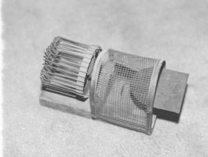 "The Electrocuter" was made in the 1930's . By hooking up two prongs to a baseboard electric outlet or an extension cord, it would supposedly kill mice when they made contact with the copper plates while going for the bait. The directions recommend putting a wet napkin in front of the trap so the mouse's feet are wet when electrocuted. The shock would throw the dead mouse 5 to 10 ft. away from the trap's entrance to make room for the next one.