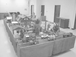 The mini farm measures 8 by 24 ft. and is displayed atop six sawhorses. It folds in the middle for transport. Numerous working parts all operate electrically using transformers, relays, and time delay relays.