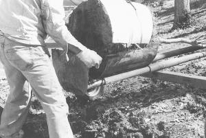 Marley first uses a backhoe to make an open trench around a tree. He manually tilts the cradle scoop down into the trench by tipping the pipes up vertical. Finally, he runs a chain from the drawbar hitch on the pipes to a tractor and drives it forward to tilt the dipper forward and out of the hole. The tree now is ready to be moved to its new location, where the plate and plastic half barrel are removed.