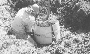 He places two half plastic barrel pieces around the rootball and straps it to the scoop. Then he slips a steel plate under the rootball - using the backhoe - and fastens that to the scoop.