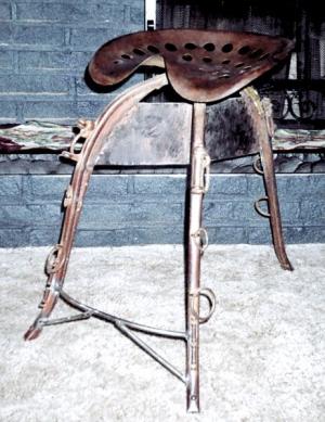 made these old fashioned metal "Hames chairs" for our neighbors who use them every day in their farm home. Hames form the legs of the chairs. I used three of them in all. The mild steel seat is off an old hay rake and was badly rusted. I welded a 3/16-in. thick, 4-in. dia. steel plate to the bottom of the seat, then welded the hames to the plate.