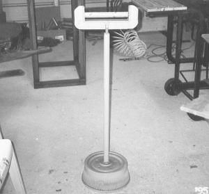 Low-Cost Stands Made For Chop Saw FARM SHOP Miscellaneous 28-3-36 Harold C. Goodwin, Sr., Yulee, Florida: "This photo shows one of two handy, low-cost stands that I made for my chop saw. It works great for cutting pipe and rebar, etc. The base is an old brake drum filled with concrete. A length of pipe is welded to the center of the drum and supports a cradle on top made out of angle iron. Material to be cut is supported by a 3/4-in. dia. length of horizontal pipe which has a length of 1/2-in. dia. rebar running through it. The rebar rides inside a plug welded onto each end of the cradle, allowing the pipe to roll freely on the rebar. The cradle's height can be adjusted by turning a nut on a bolt welded to the top of the vertical pipe stand.