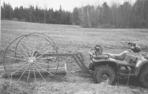 Borland stripped the rake down to the two big wheels and the frame. He cut it down to a width slightly wider than the ATV wheels. Using braces from the rake, a section of the frame and 3-in. channel iron, he formed a hitch.